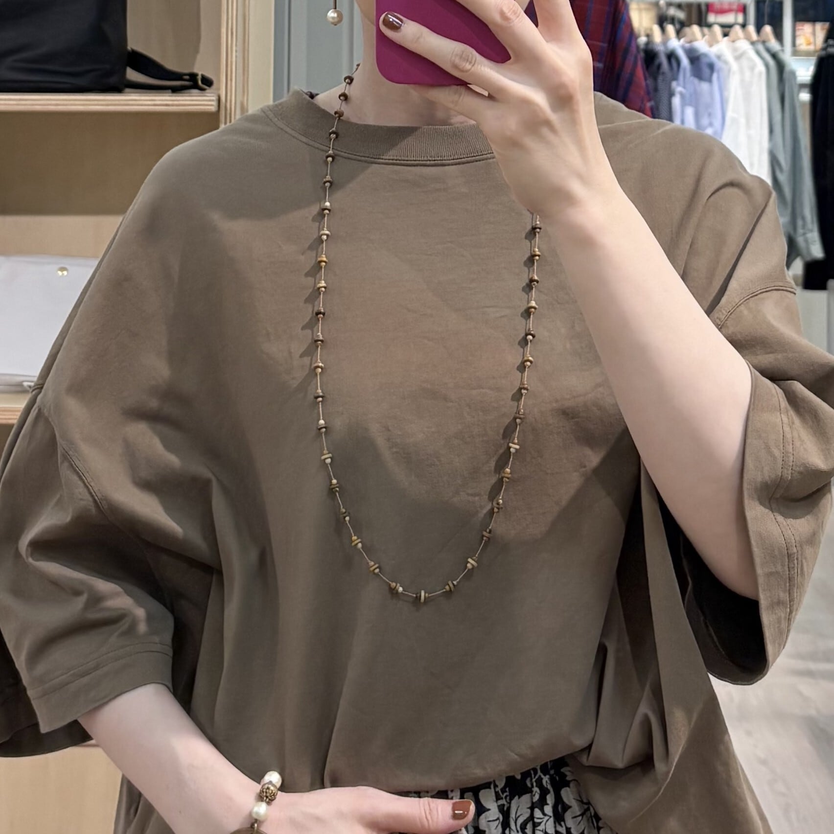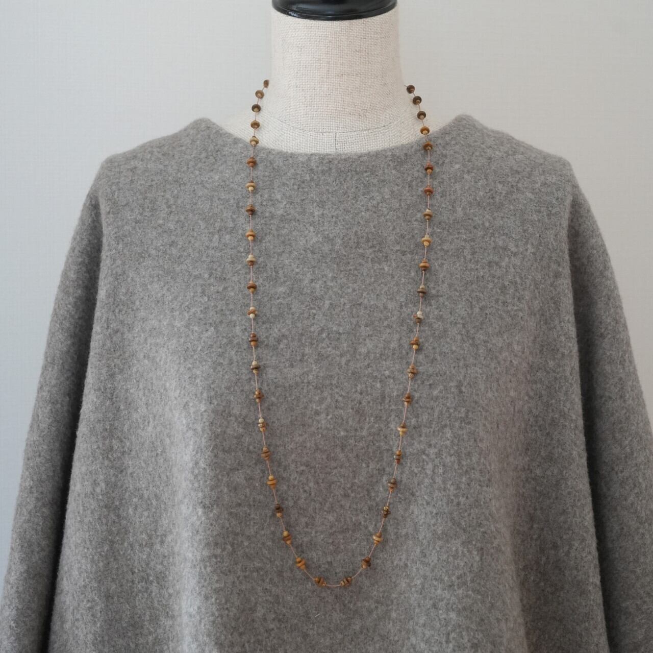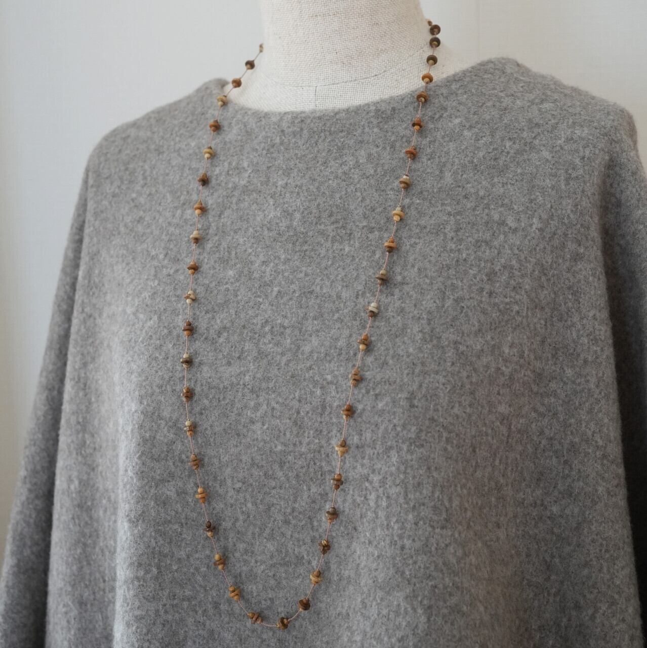 茶色やベージュ、アイボリー。カフェオレのような色合いと、まるで木のようなテクスチャーが魅力的です。素朴でありながらスタイリッシュなネックレス。