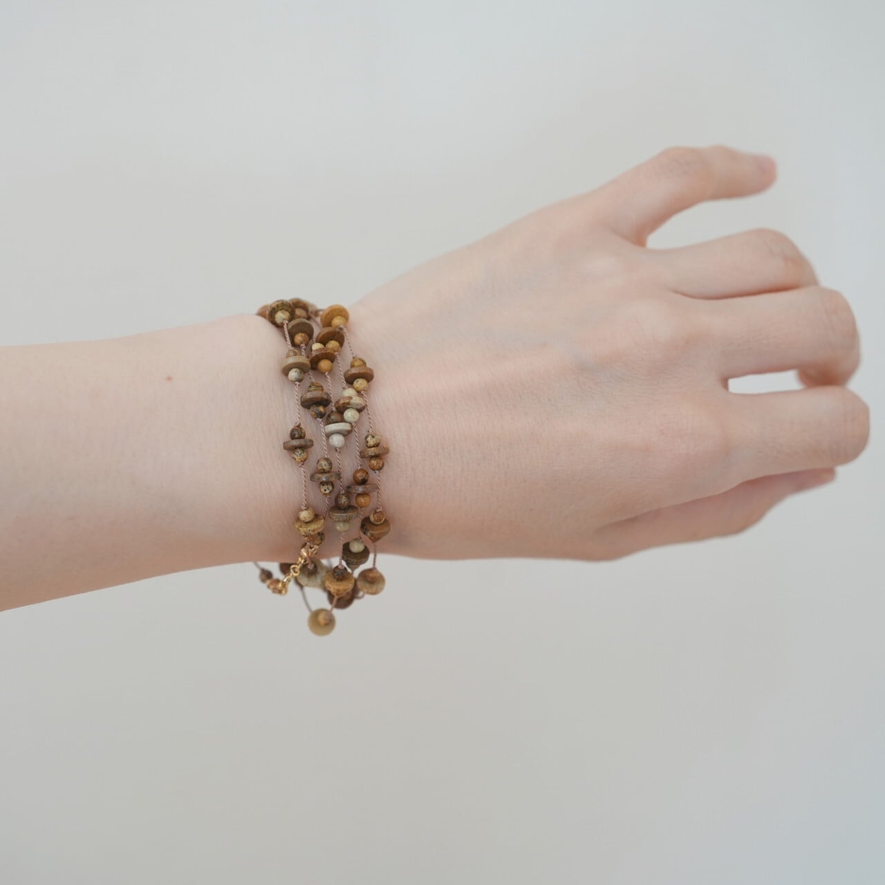 素材:ジャスパー(ラウンド約3mm、ディスク型約6×2mm)、シルクコード(ベージュ)、14Kゴールドフィルド