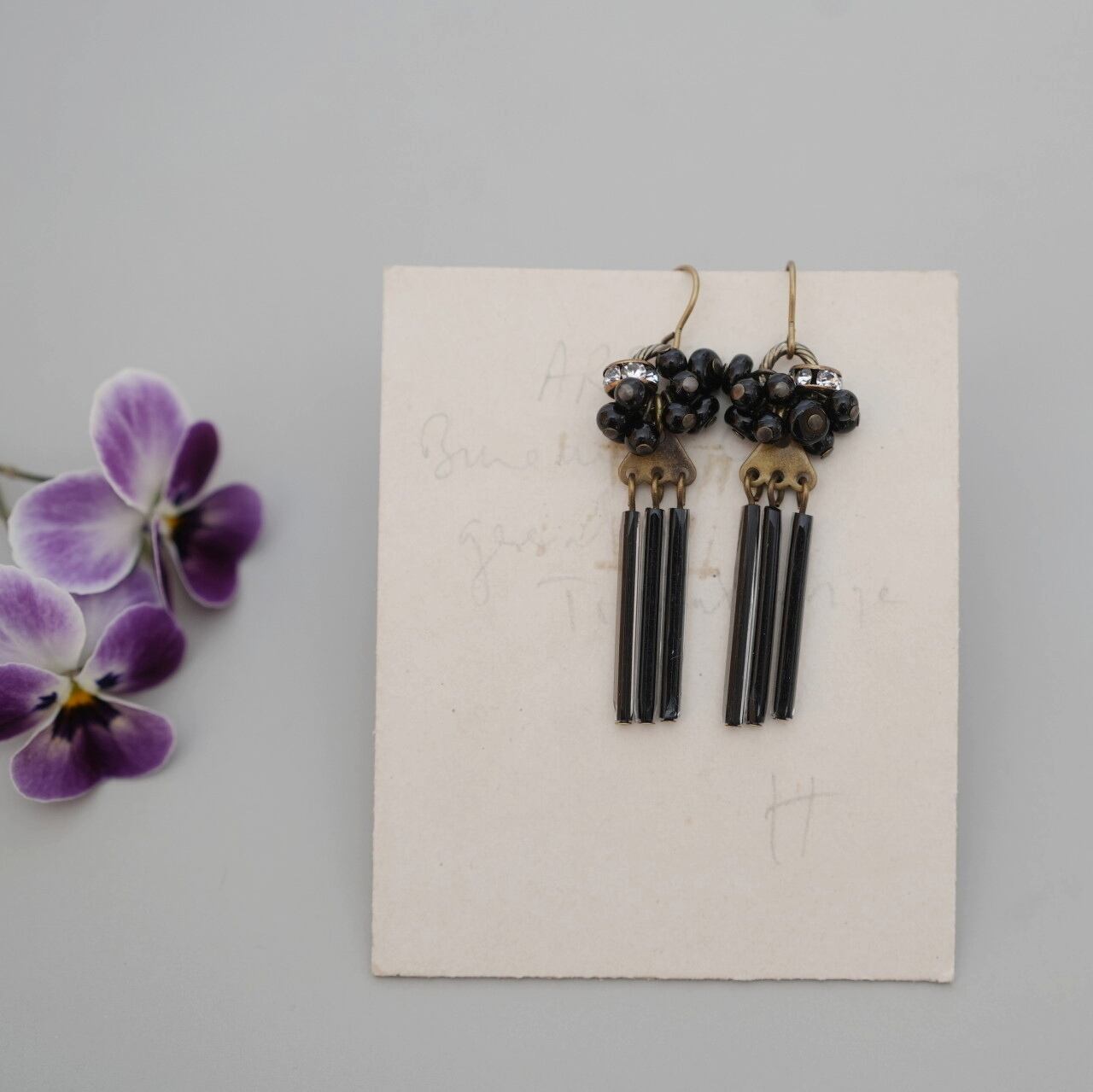 素材:ヴィンテージビーズ、オニキス、ラインストーン、真鍮にメッキ