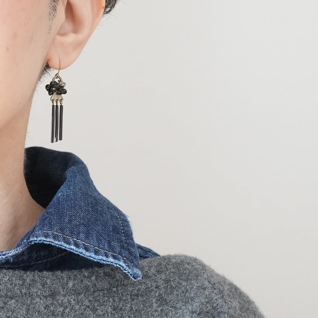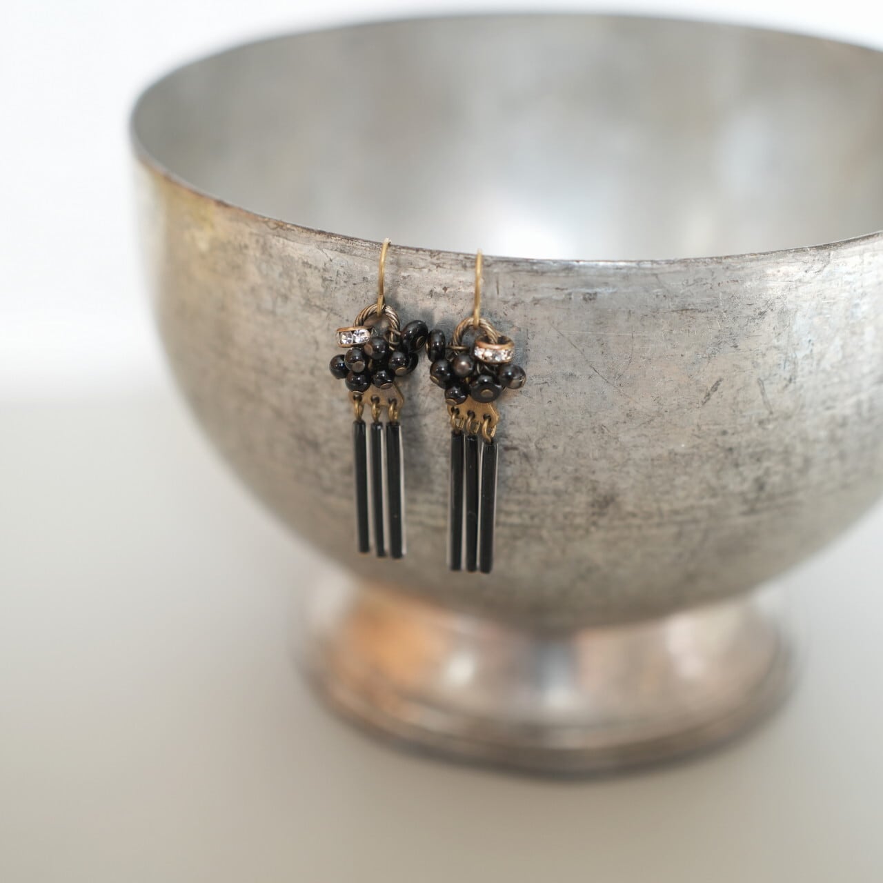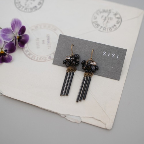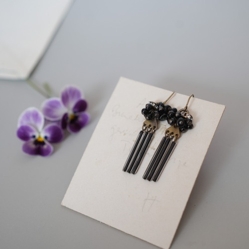 オニキスとヴィンテージビーズを使用した、揺れるピアスです。艶のある漆黒のオニキスとヴィンテージビーズが、シックで洗練された印象を与え、さりげなく輝くラインストーンが華やかさを添えます。耳元で揺れるデザインは、デイリーユースから特別な日まで幅広いシーンで活躍します。