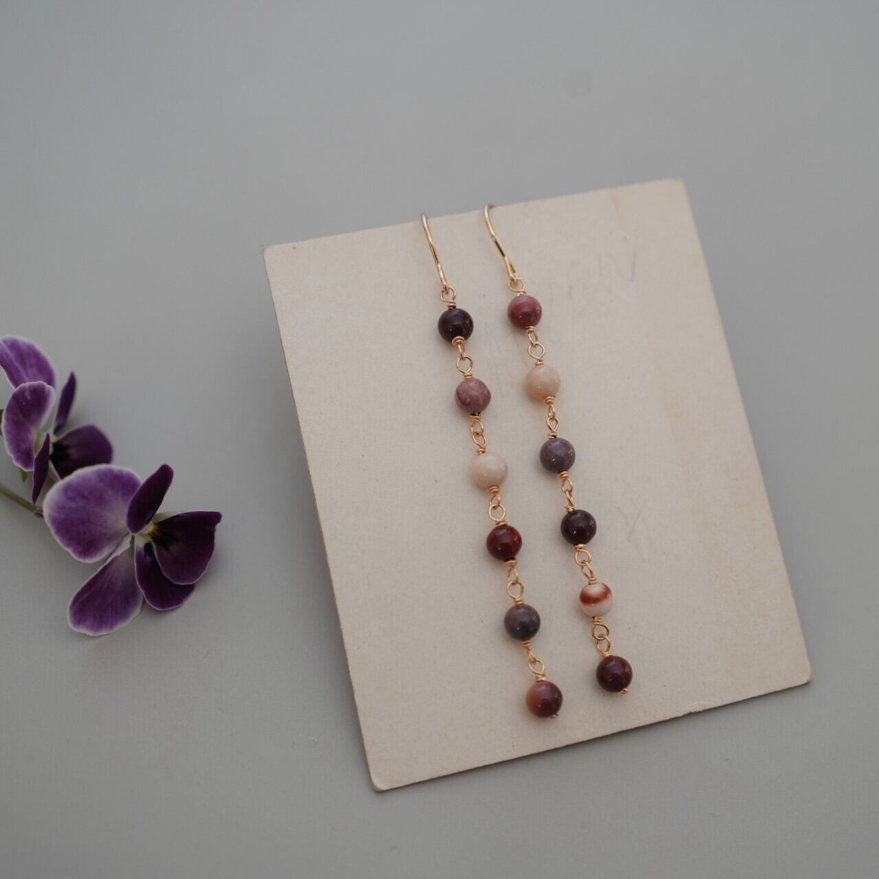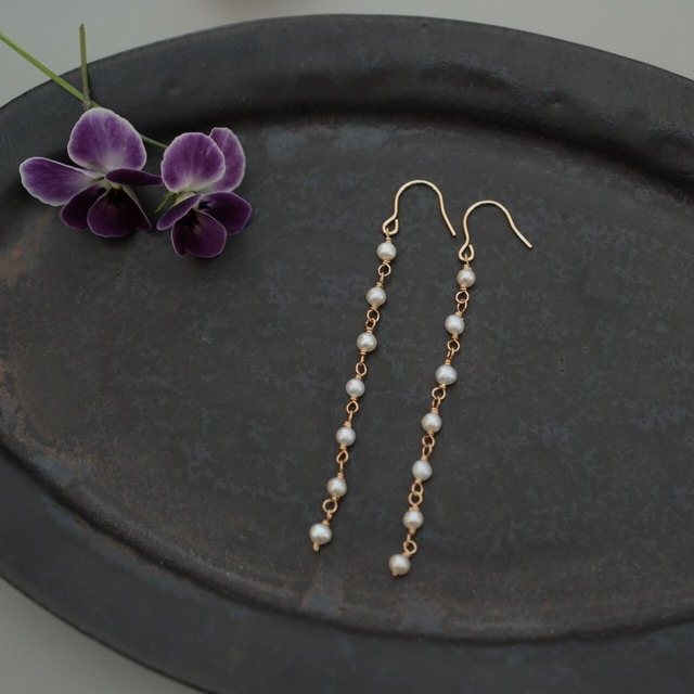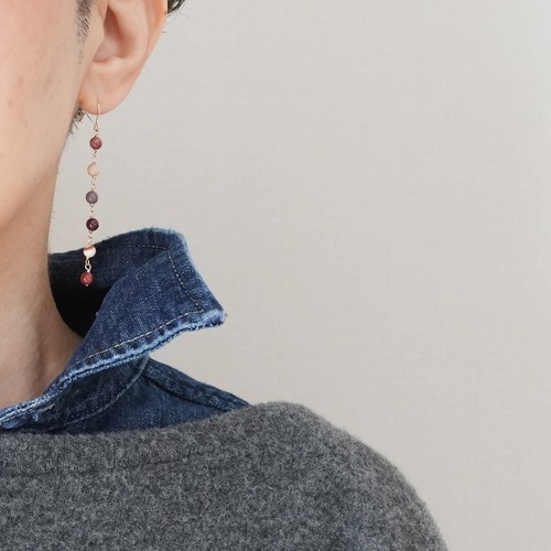 ムーアカイトと14Kゴールドフィルドを使用したロングピアス。すっきりとした縦長の優雅なデザインで、チョコレートのようなこっくりとした独特な色合いです。耳元で優しく揺れ、上品な印象を与えます。デイリーユースから特別な日まで、幅広いシーンでお楽しみいただけるアイテムです。