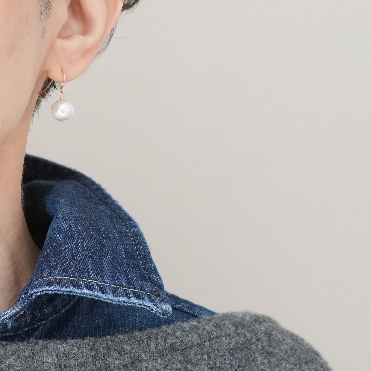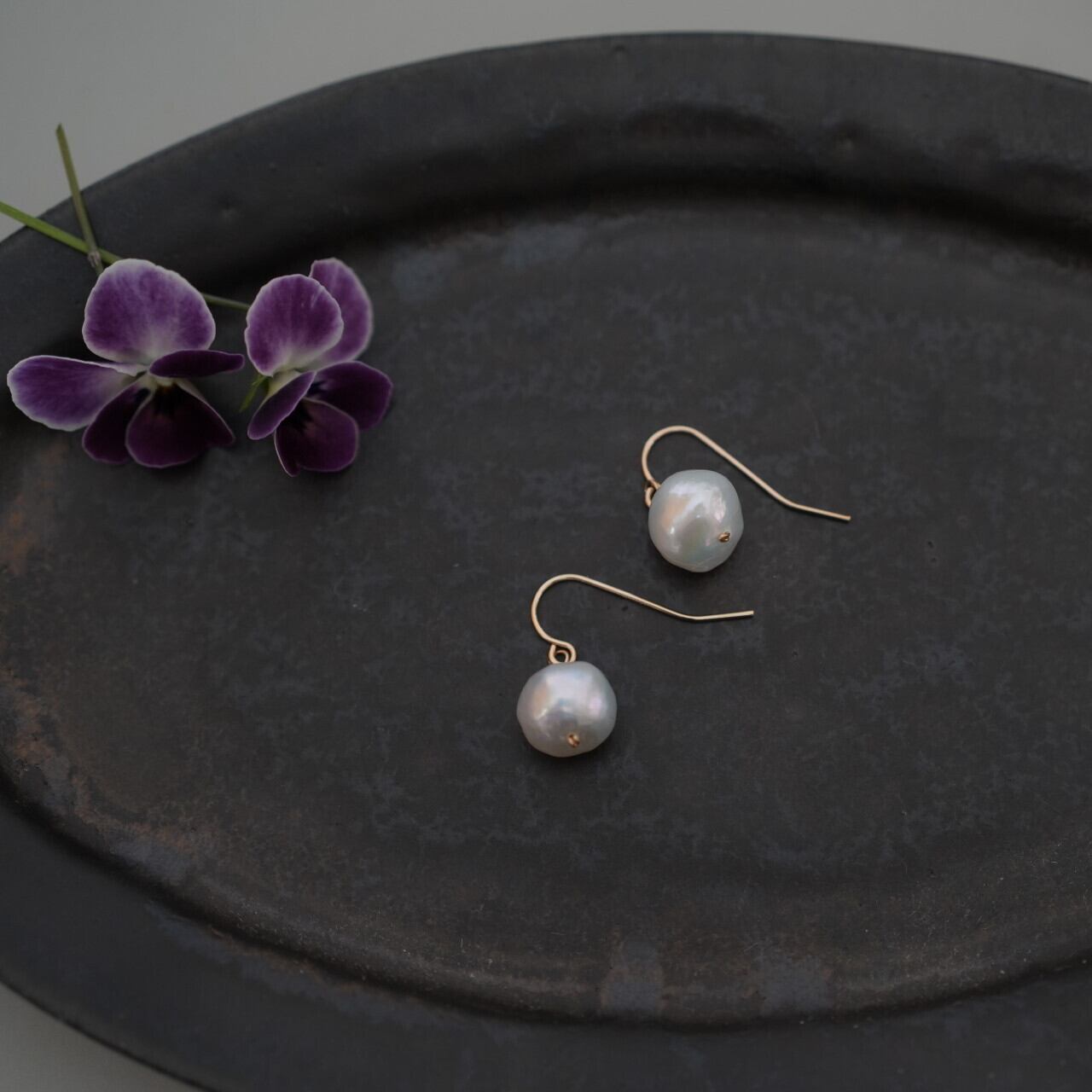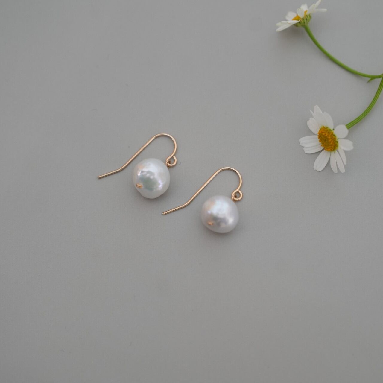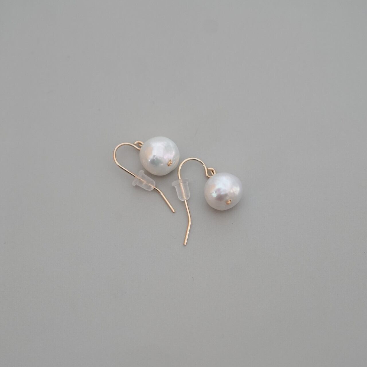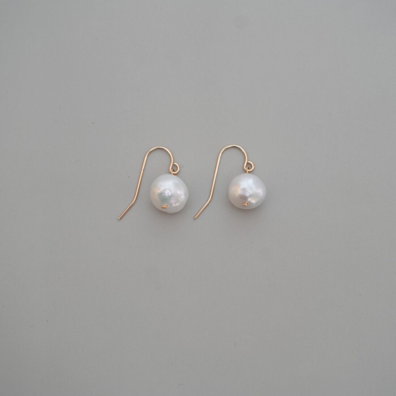 淡水パールと14Kゴールドフィルドのピアス。大ぶりの淡水パールは、いびつなラウンド、天然由来の凸凹、美しい照りに艶・・・ナチュラルな魅力いっぱいでありながら、アンティークパールのような雰囲気も併せ持っています。耳元で優雅に揺れるデザインは、デイリーユースからオケージョンまで幅広いシーンでお楽しみいただけます。毎日のスタイルに華を添える、素敵なアイテムです。