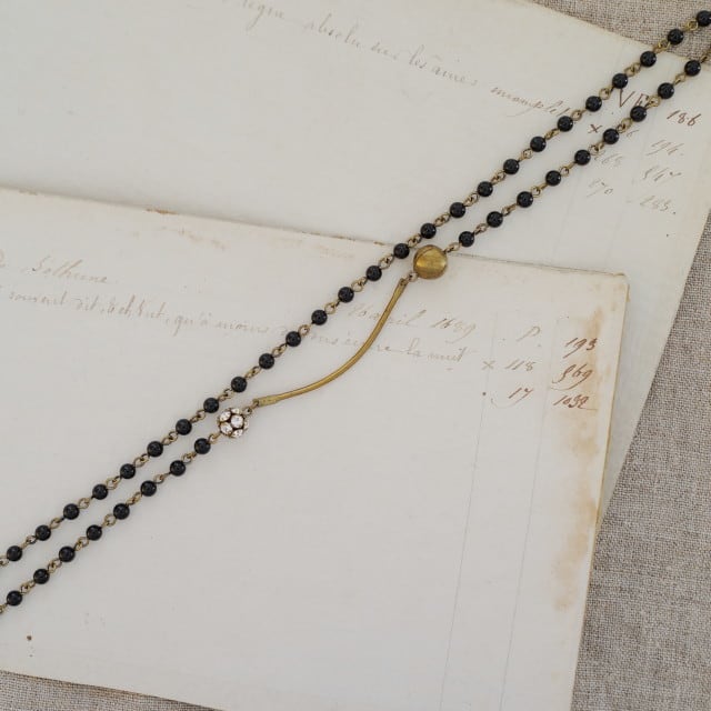 艶のあるオニキスに、カーブを描くヴィンテージのブラスパーツがアクセントのロングネックレス。