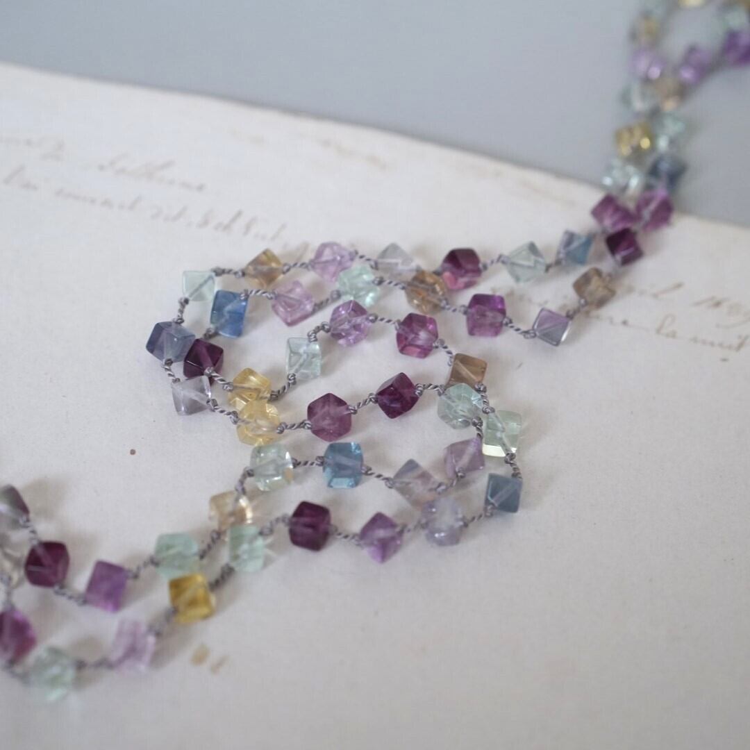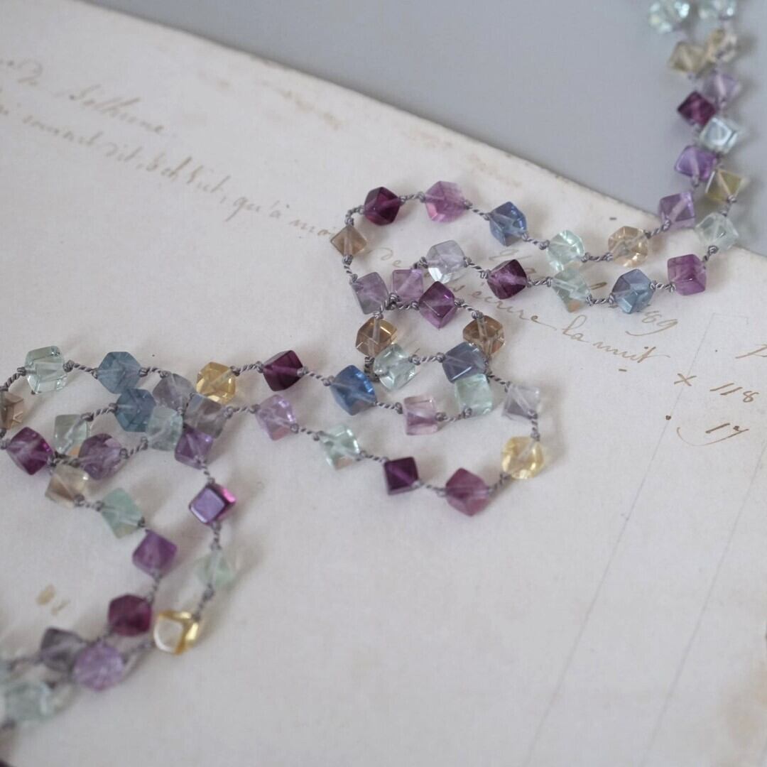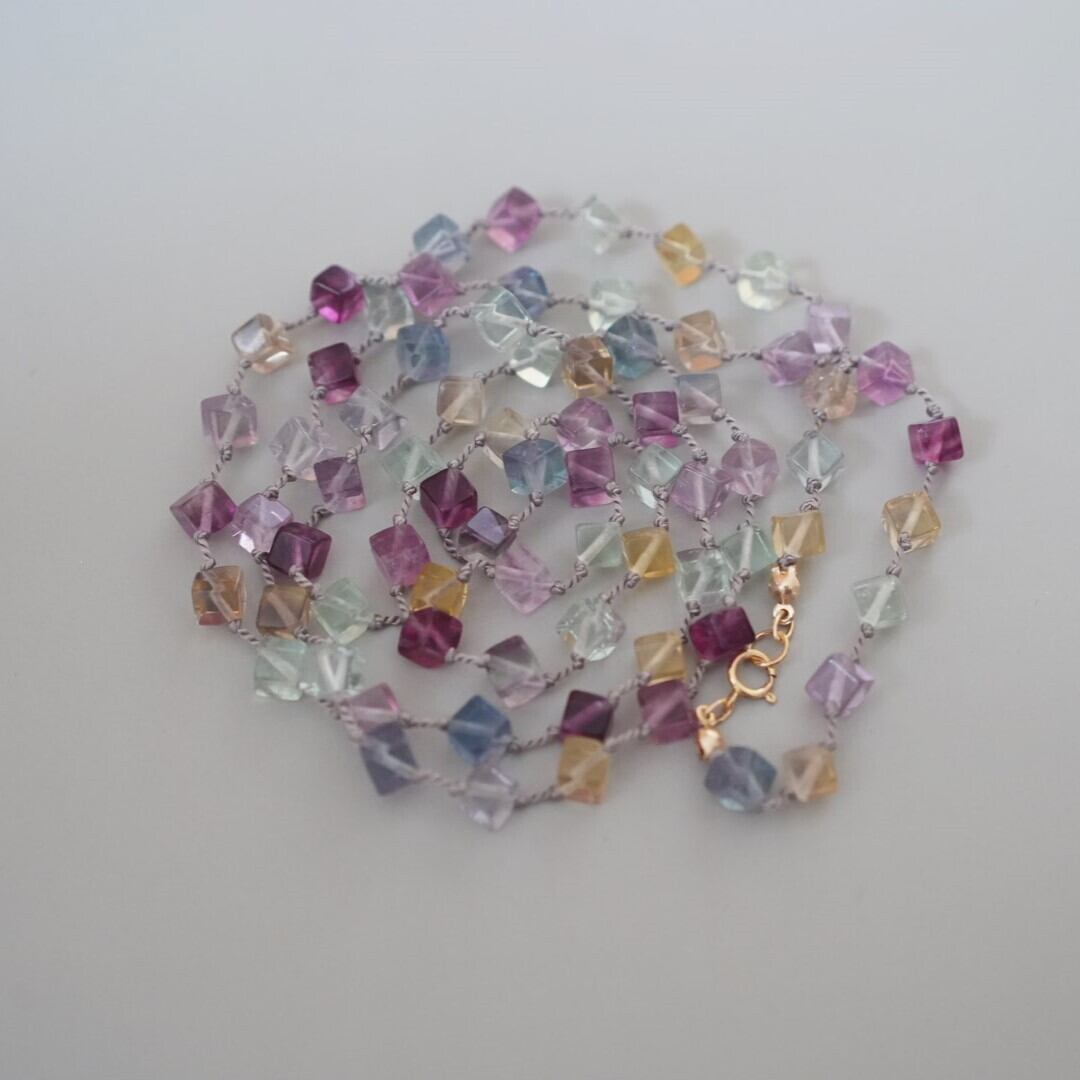 涼しげなダイスカットのフローライトをシルクコードで繋いだネックレス。