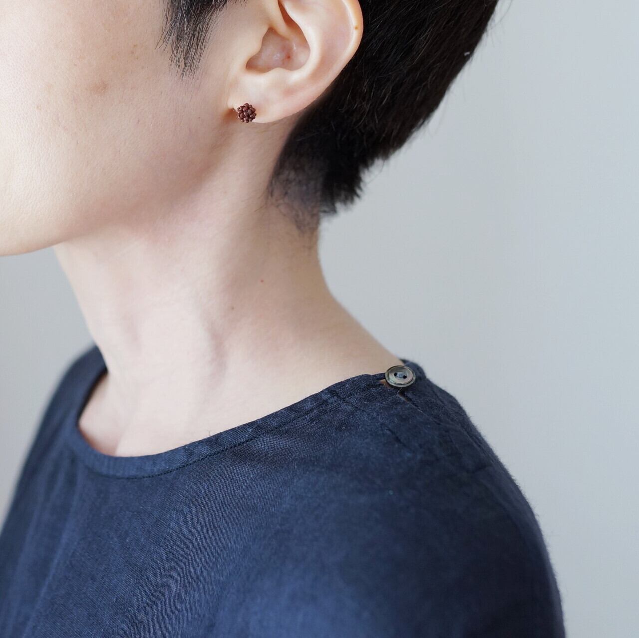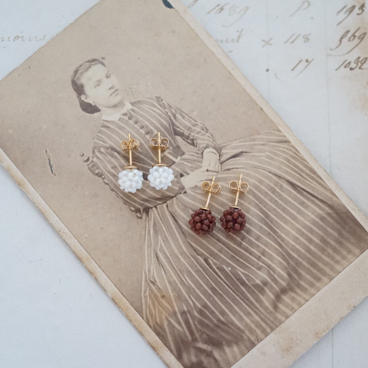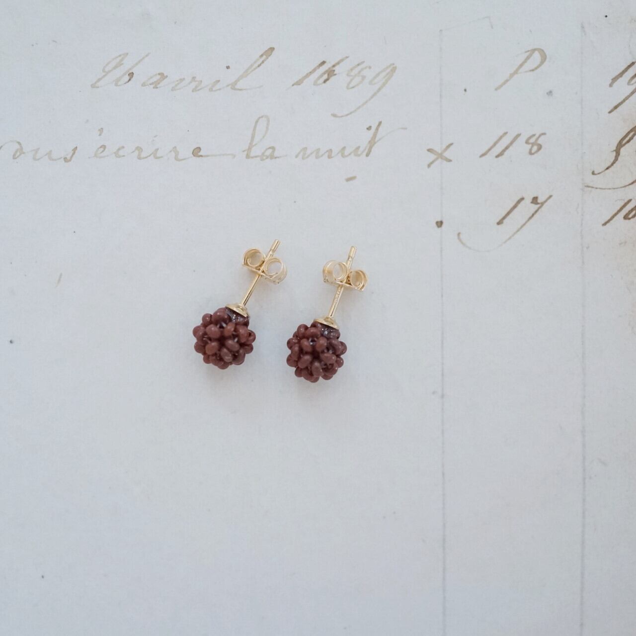 とてもちいさなアンティークのシードビーズをお団子状に編み込んだ、シンプルなピアス。