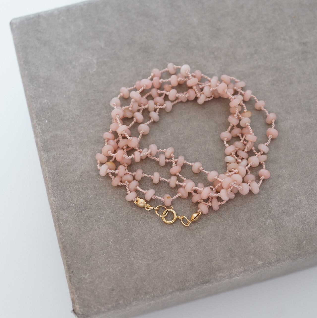 ソープストーンを薄ピンクのシルクコードで繋いだネックレス。