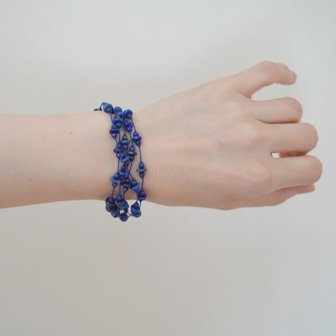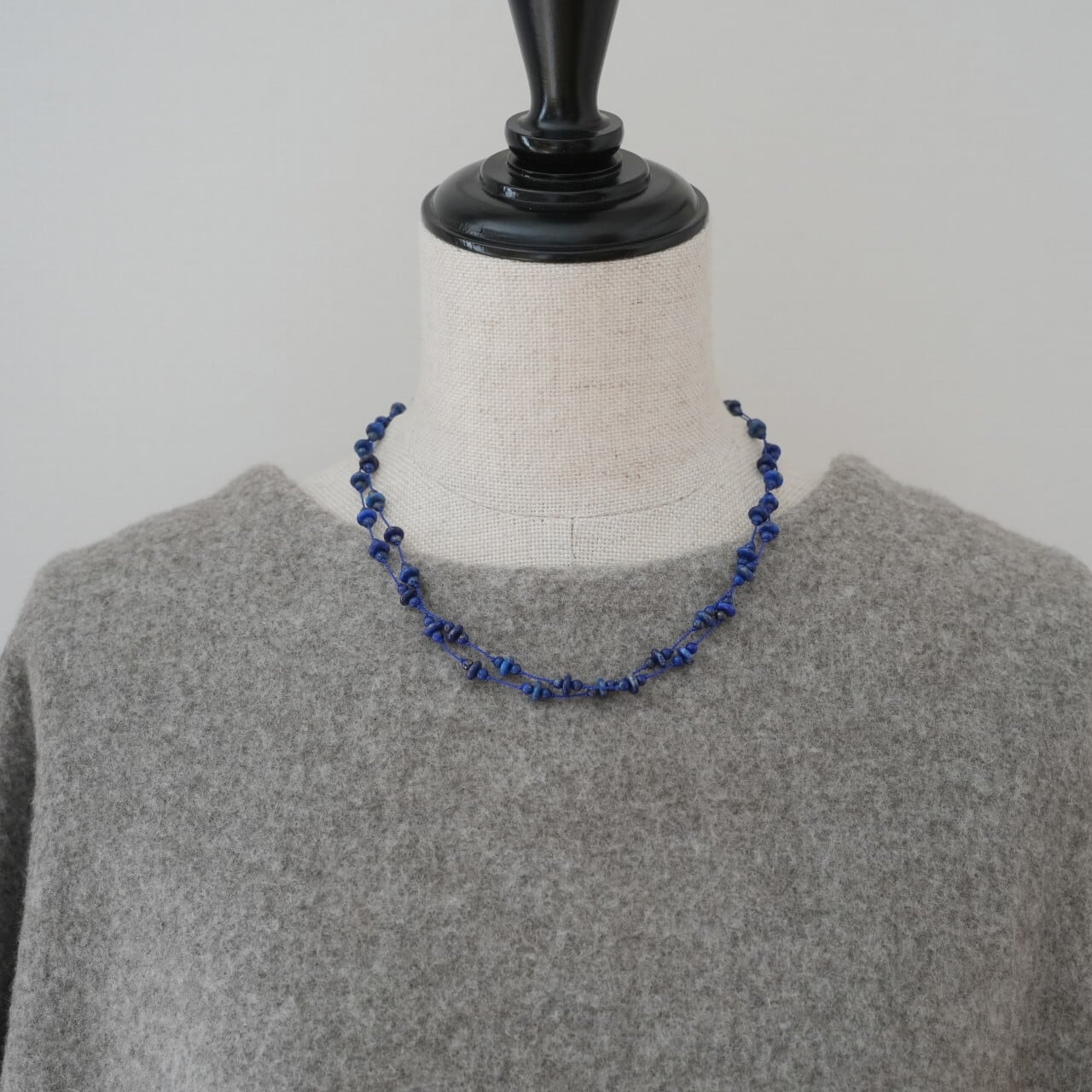 素材:ラピスラズリ(ラウンド約3mm、ディスク型約6×2mm)、シルクコード(ブルー)、14Kゴールドフィルド