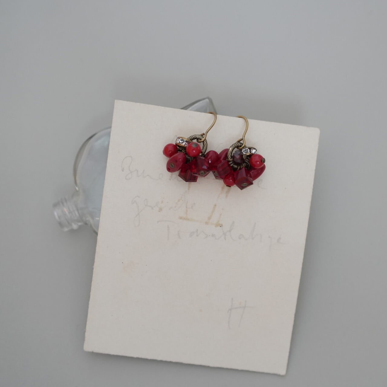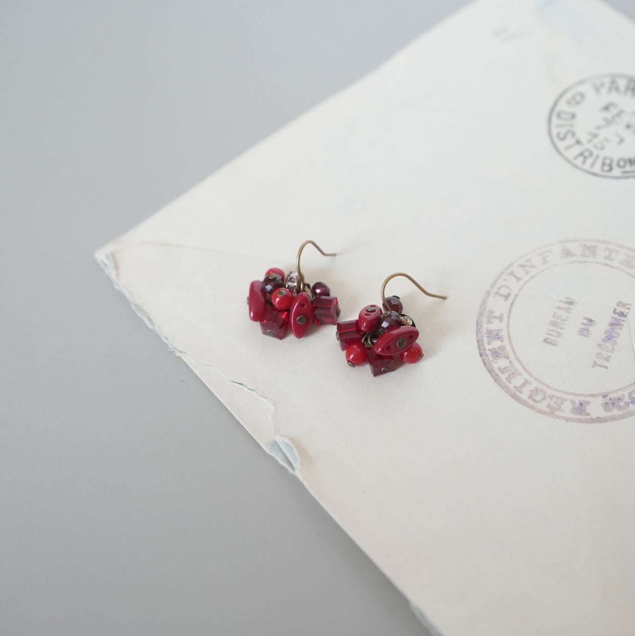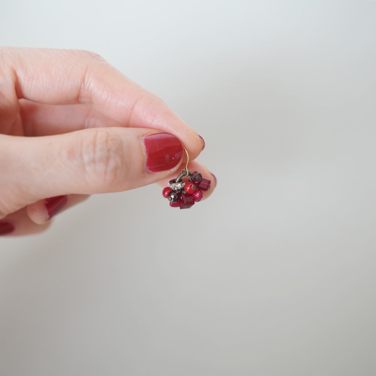 ガーネットにスワロフスキー、チェコビーズやヴィンテージビーズなど、きらきら透明感やマットで個性的な形のものを組み合わせています。落ち着いた色合いの赤なので取り入れやすく、お顔周りを華やかに彩ります。